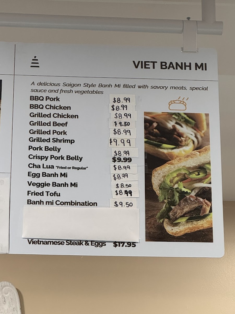 (Bo ne) this meal consists of sizzled beef and sunny side up egg, meatball, Viet ham with chicken pate spread and Viet mayo dashed across crisp fresh bread